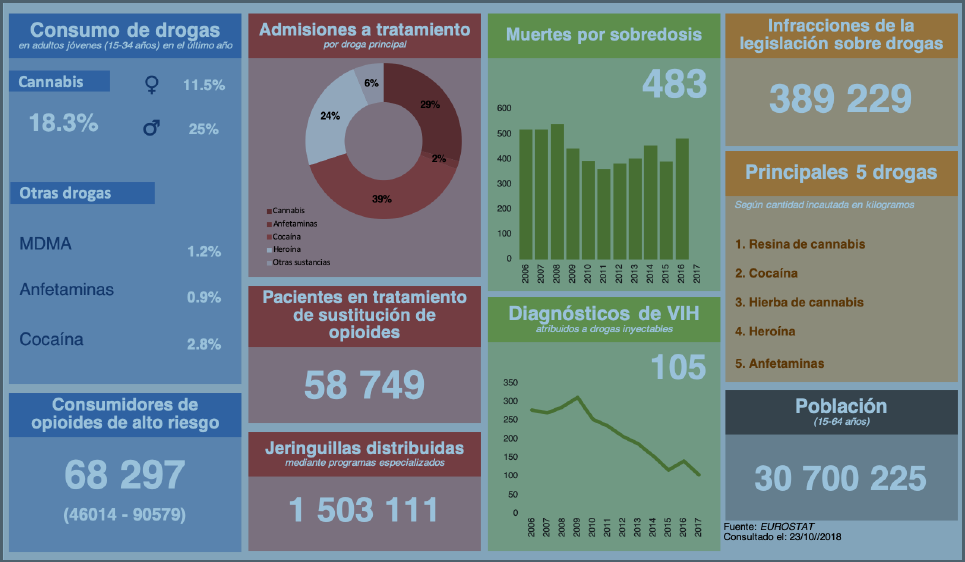 Este informe presenta un planteamiento general de alto nivel sobre el fenómeno de las drogas en España. Aborda la oferta de drogas, el consumo de las mismas y los problemas de salud pública asociados, así como las políticas de drogas y las respuestas. Este informe ha sido elaborado por el Observatorio Europeo de las Drogas y las Toxicomanías (EMCDDA) a partir de la información notificada por la Delegación del Gobierno para el Plan Nacional sobre Drogas, que facilita datos propios y coordina la recogida de información de otras instituciones.